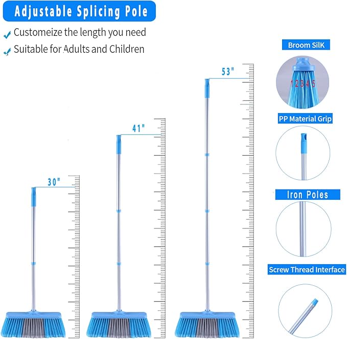 - Long Handled Design The dust broom is built in 4 iron poles that can be adjusted from 18.5" to 53", the dust pans with 3 stainless steel is 35" in height. YONILL broom and dustpan set for home is best choice to cleaning your home